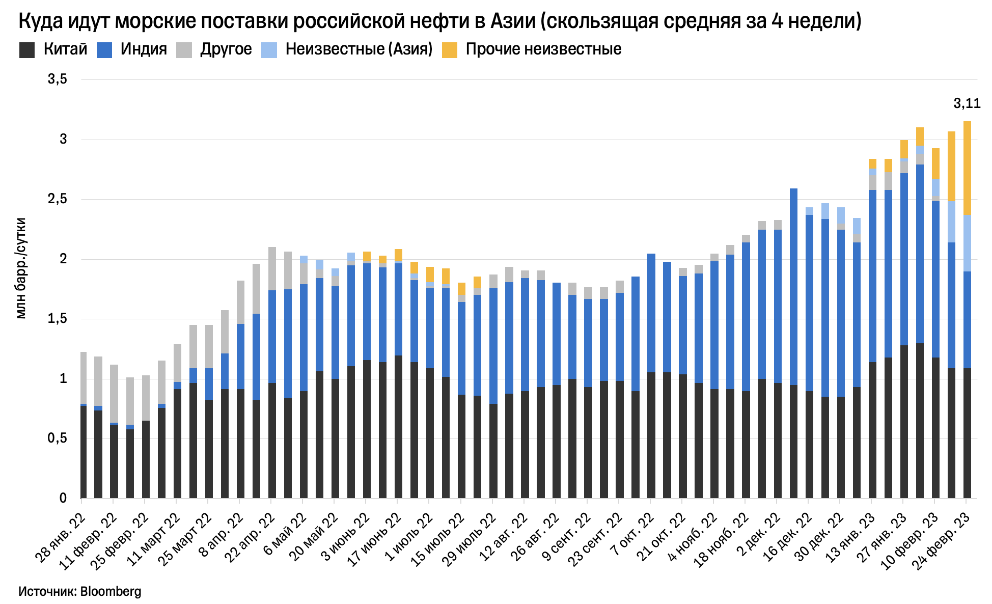 Средний объем поставок российской нефти азиатским покупателям вырос более чем в два с половиной раза с января 2022-го — до 3,11 млн баррелей в сутки (более 90% всех текущих поставок). Около 60% из них идут в Китай и Индию, остальное поставляется на судах, на которых еще не указан конечный пункт назначения. Но история показывает, что эти суда могут оказаться в итоге в Индии.