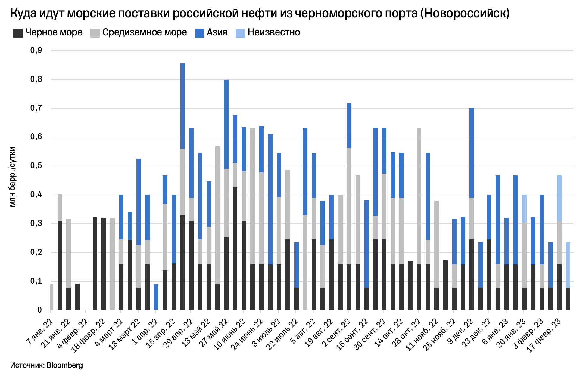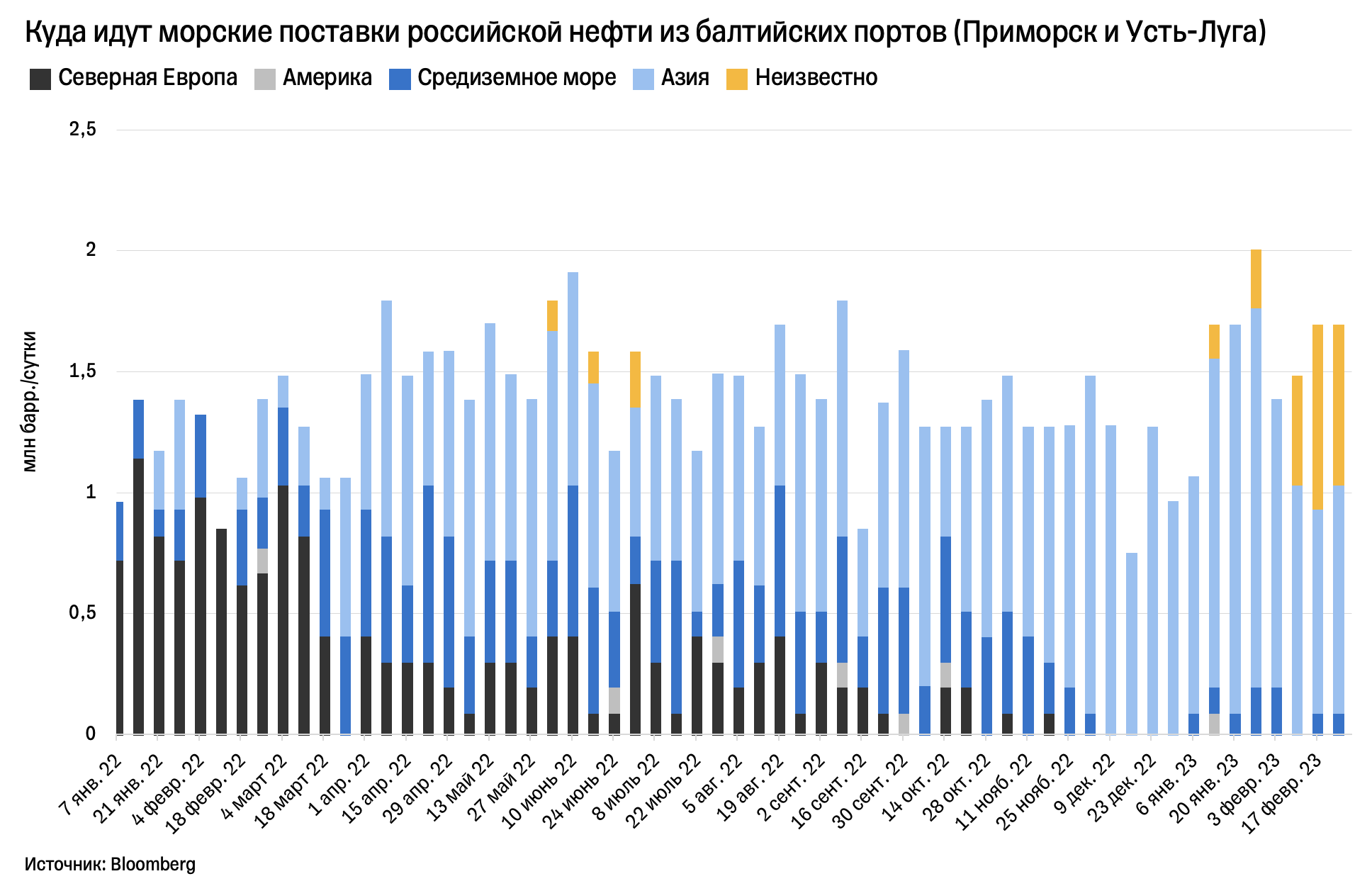 С портов Балтийского моря, Черного моря и Мурманска поставки теперь тоже идут преимущественно в Азию и/или в неизвестный пункт назначения.