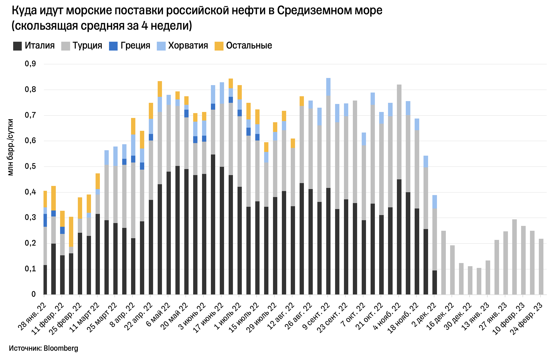 Средний объем поставок российской нефти европейским покупателям (за исключением Турции) рухнул почти в 14 раз с января 2022-го — до 104 тысяч баррелей в сутки. Единственный пункт назначения, который остался, — Болгария. Она смогла добиться освобождения от европейского эмбарго на морские поставки российской нефти, которое вступило в силу 5 декабря 2022-го, и сможет сохранить покупки до конца 2024 года. Несмотря на это, нефтеперерабатывающий завод Лукойла в Бургасе (Болгария) может в марте начать использовать не только российскую нефть, допускает Bloomberg.