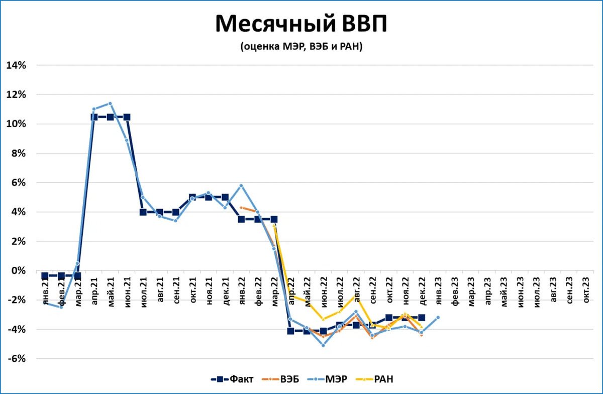 1. Мы видим (см. график), что в последние месяцы Минэк со своими месячными оценками постоянно промахивался. И всегда попадал ниже, то есть, по факту оказывалось лучше.