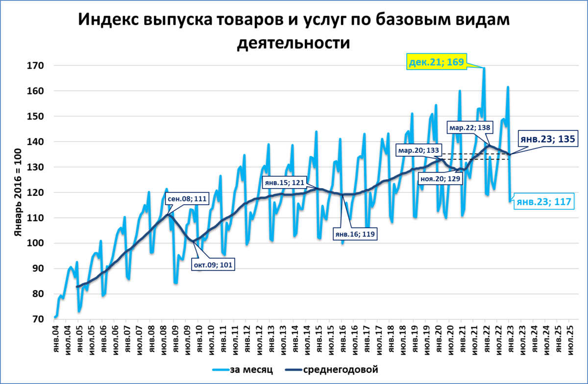 Индекс падает с апреля 2022 года. Но несмотря на такое продолжительное (10 месяцев) падение, он в своих среднегодовых значениях (график 2, тёмно-синяя линия) выше, чем был в начале 2020 года, до пандемии.