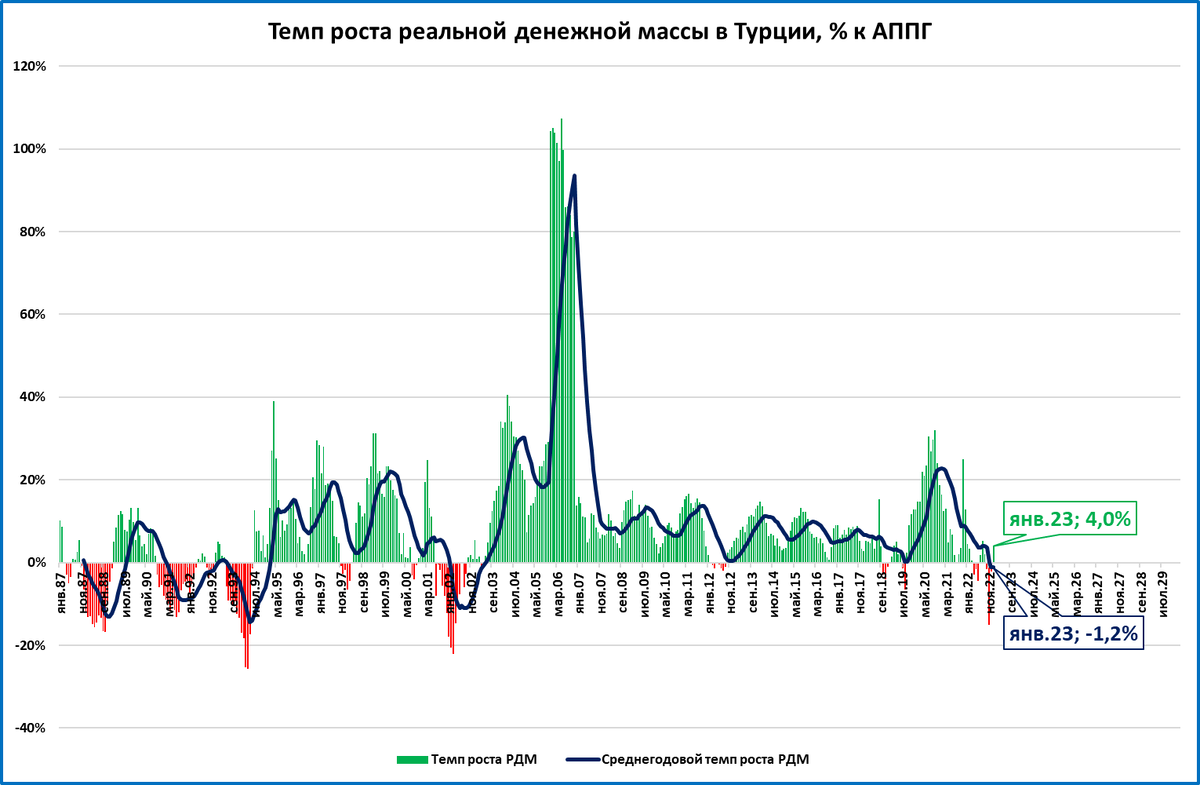 В последнее время этот механизм начал давать сбой. Несколько месяцев (апрель-июнь и октябрь-декабрь) реальная денежная масса (РДМ) сокращалась. Это одна из главных причин замедления ВВП Турции к концу года.