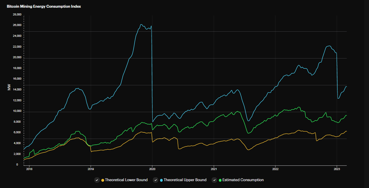 Можно отметить, что текущий расчетный уровень энергопотребления примерно соответствует аналогичным показателям 2021 и 2022 годов. В целом майнеры все более склонны ориентироваться на дешевую альтернативную или так называемую вторичную электроэнергию, минимизируя издержки, что особенно актуально во время медвежьего цикла. Также невысокий рост уровня энергопотребления связан с использованием более энергоэффективного оборудования.