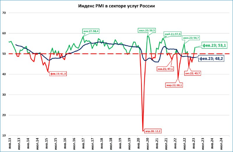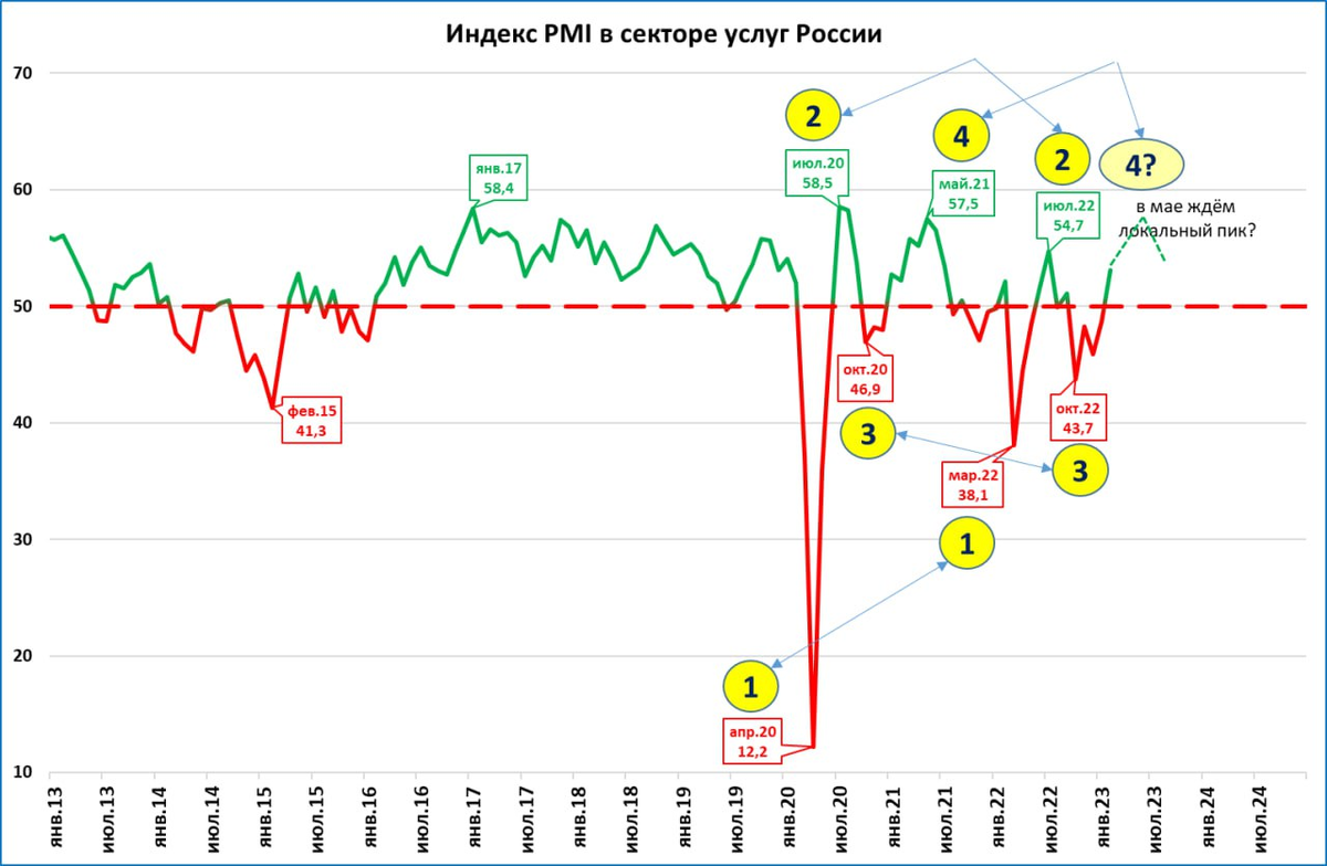 Наблюдая за графиком PMI в секторе услуг, можно обнаружить удивительную «синхронность» кризисов 2020 и 2022 года. Следим за жёлтыми кружочками с цифрами.