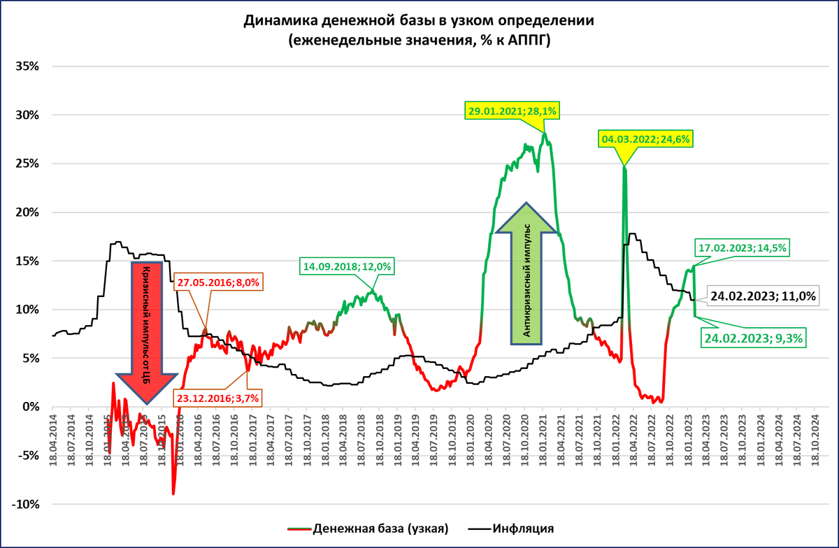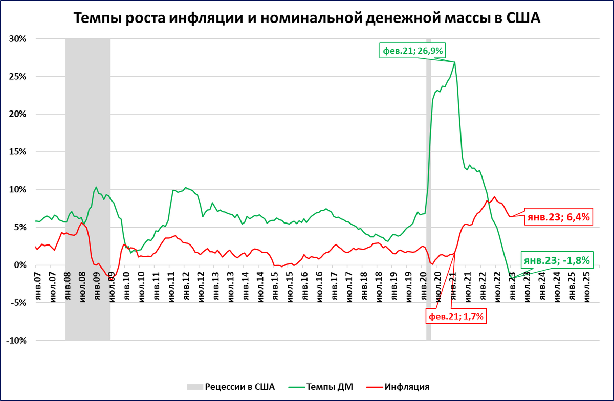 Как видно на графике, рост денежной массы (зелёный цвет) вплоть до последних месяцев опережал инфляцию (красный цвет).