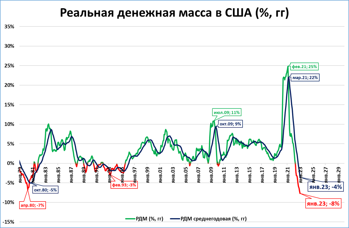 С учётом инфляции, то есть, в реальном выражении, денежная масса сжалась на 8%. Это сжатие круче, чем в конце 1970-х — начале 1980-х.