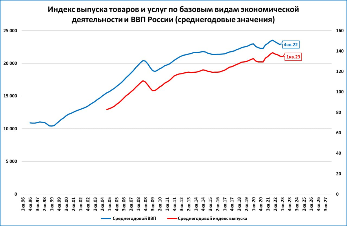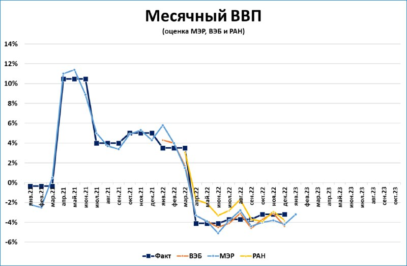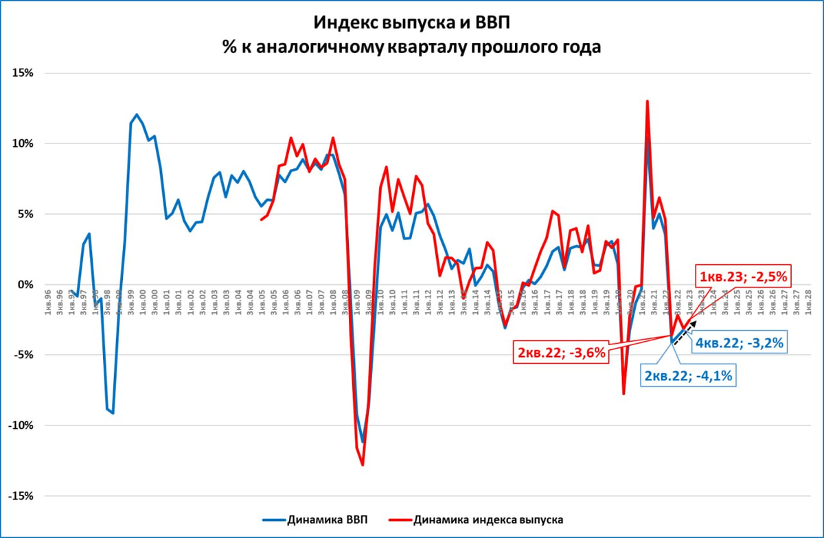 Это означает, что падение ВВП в 1 квартале 2023 будет менее глубоким, чем падение ВВП 4 квартала 2022 года (-3,2%).