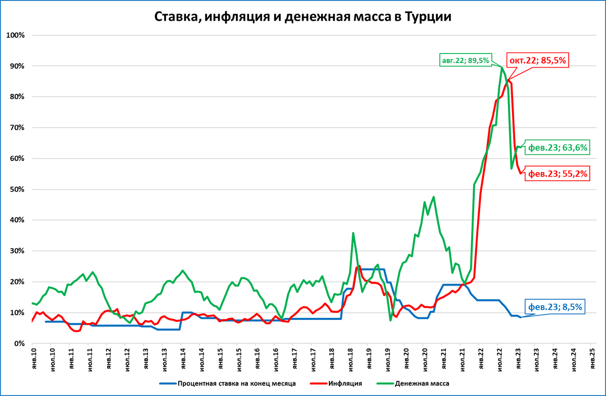В Турции, несмотря на высокую инфляцию, в феврале денежная масса растёт быстрее цен – выполняется главное правило экономического роста.