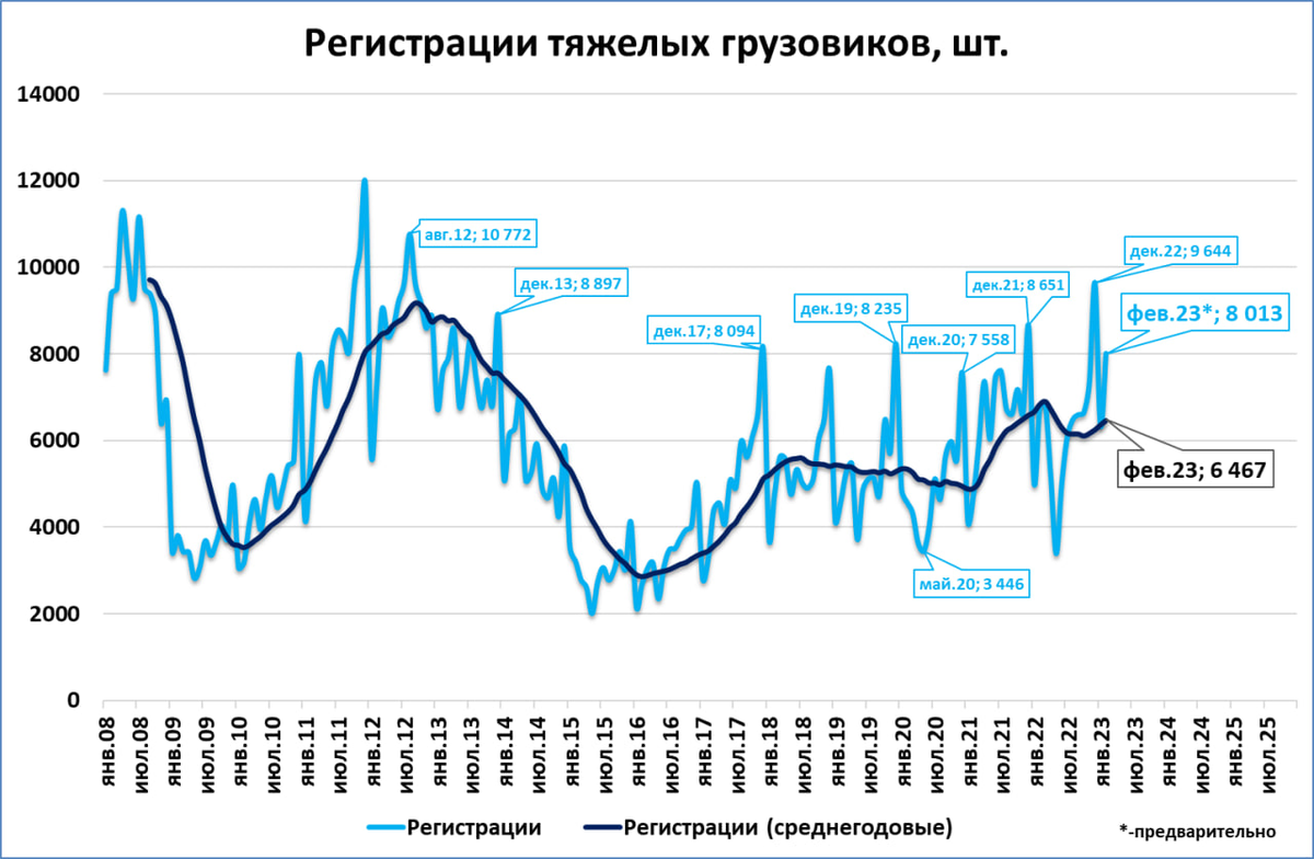 По нашей предварительной оценке, на основе данных агентства Автостат, в феврале было зарегистрировано 8 013 тяжёлых грузовиков.