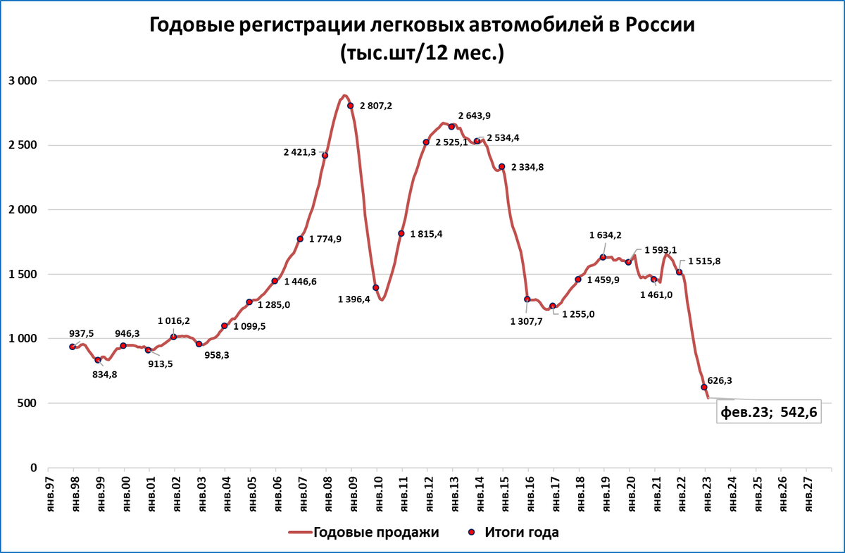 -- Падение на российском рынке легковых автомобилей замедляется. В феврале (-43%) оно минимальное с апреля 2022 года, когда рынок падал на 84%.