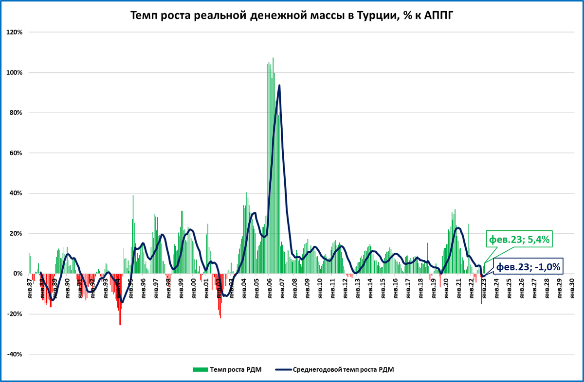 В последнее время этот механизм начал давать сбой. Несколько месяцев (апрель-июнь и октябрь-декабрь) реальная денежная масса (РДМ) сокращалась. В этом - одна из главных причин торможения турецкой экономики к концу 2022 года.