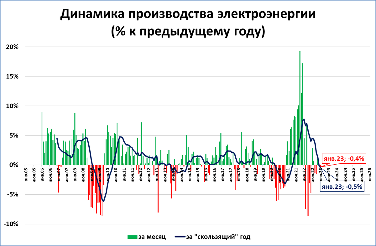 В январе производство электроэнергии снизилось на символические 0,4% по отношению к январю прошлого года.