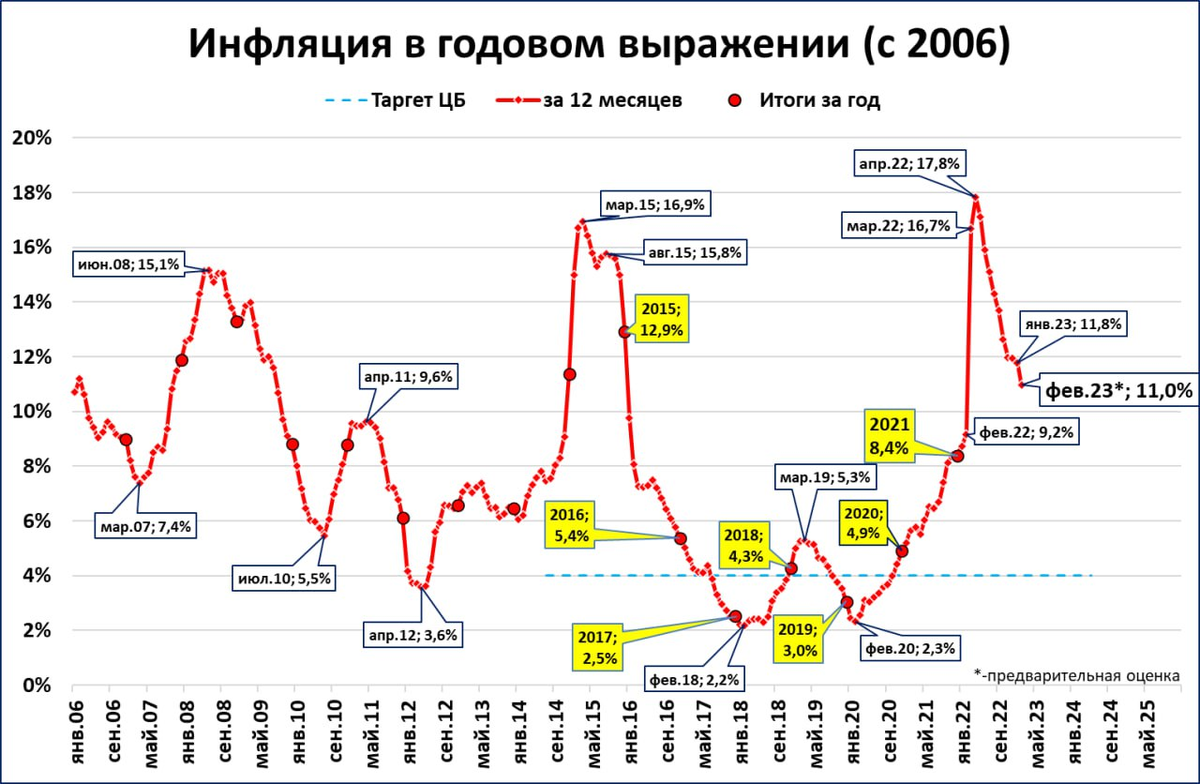 Инфляция по итогам февраля составит порядка 11% годовых.