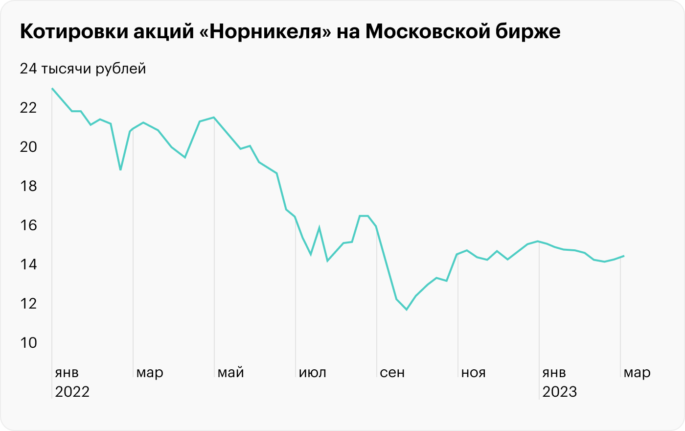 В 2022 году котировки «Норникеля» потеряли более 33%. С октября 2022 года наблюдается восстановление, связанное в первую очередь с девальвацией рубля.