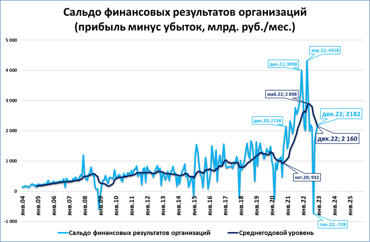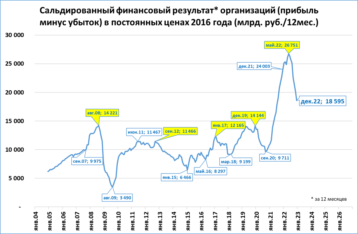 Падение прибыли организаций возможно вплоть до апреля-мая 2023 года в связи с тем, что в апреле-мае 2022 года были установлены исторические рекорды показателя в номинальном и реальном выражении.