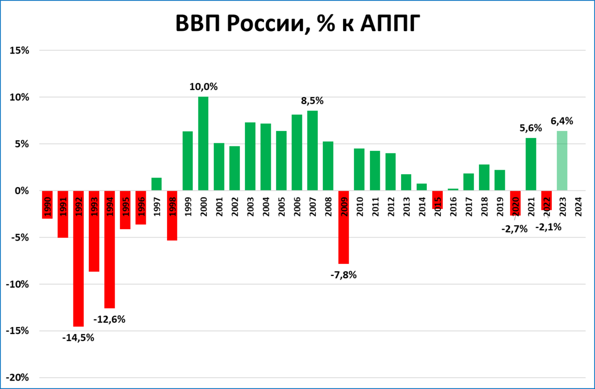 Заметим, что даже такой рост ВВП заметно выше имеющихся прогнозов. Так, МВФ прогнозирует околонулевой рост ВВП России в 2023 году (+0,3%), прогноз Банка России примерно такой же (-1% … +1%).