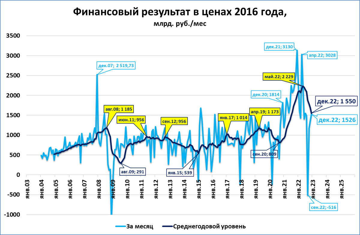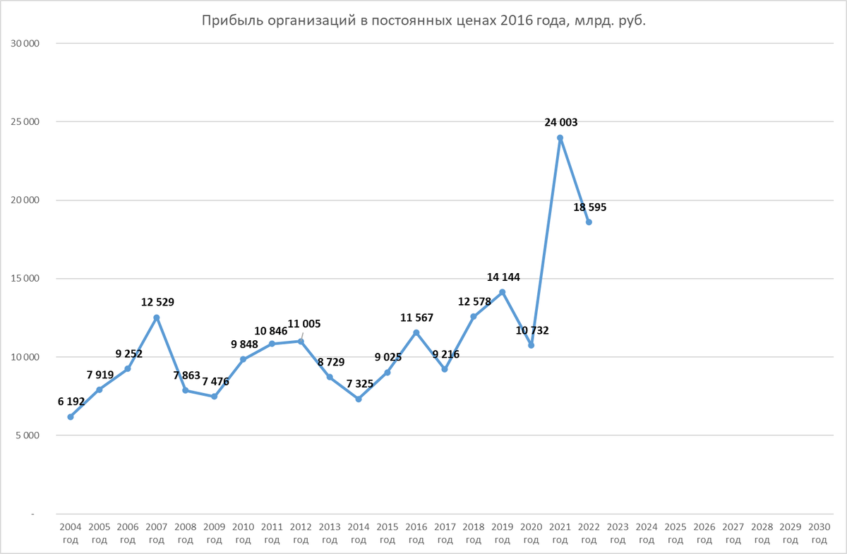 По итогам 2022 года (18,6 трлн рублей в постоянных ценах 2016 года) реальная прибыль уступает лишь результатам 2021 года (когда прибыль достигала 24 трлн рублей в постоянных ценах 2016 года).