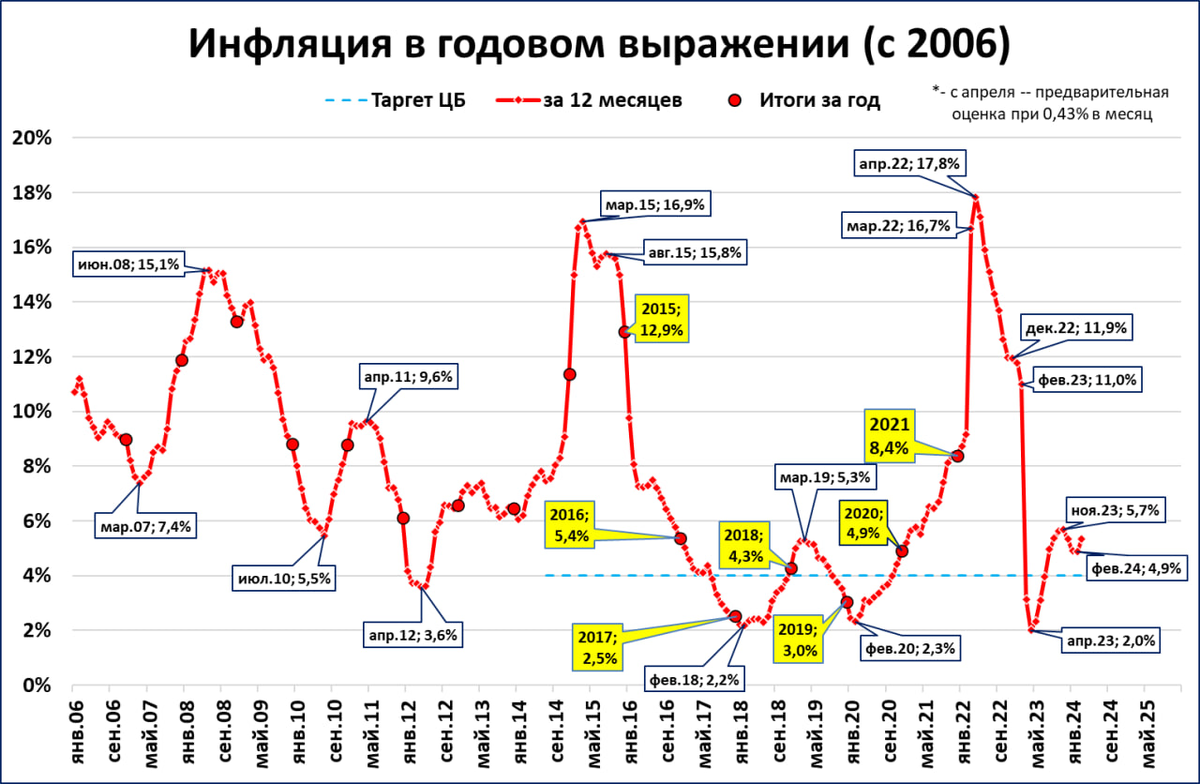Фактический рост цен может быть как выше, так и ниже этого уровня. Но общее представление о динамике цен при этом остаётся тем же: снижение инфляции до апреля, затем — рост.