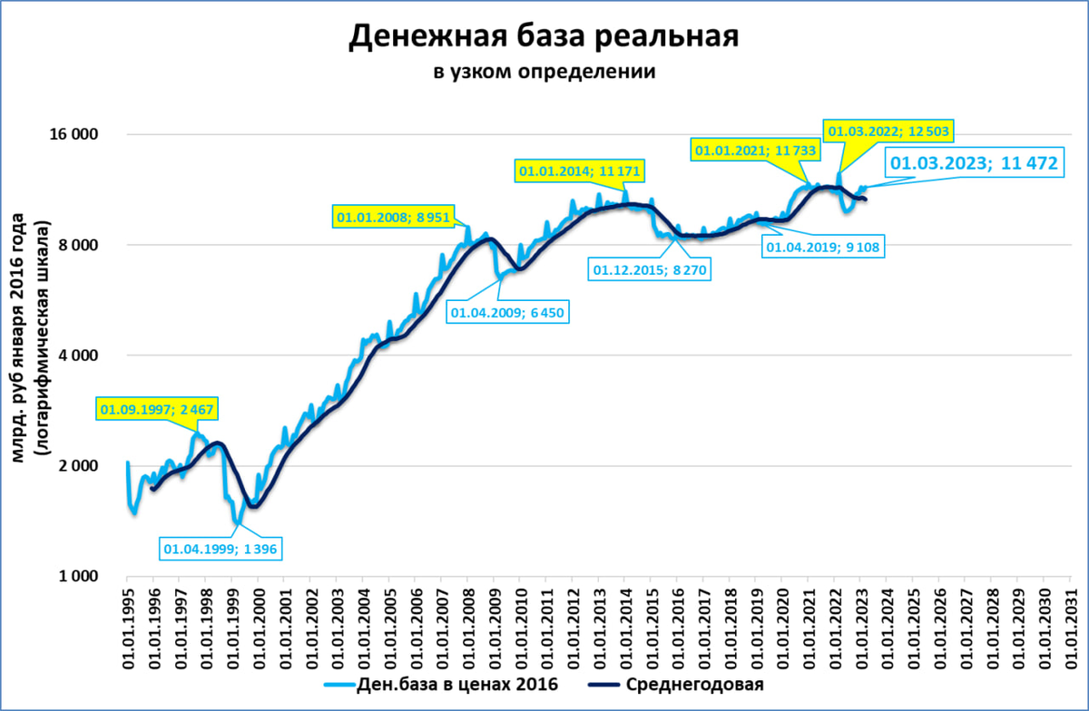Узкая денежная база на 1 марта установила номинальный исторический рекорд (16,6 трлн руб.), но в реальном выражении (с учётом инфляции) снизилась по отношению к 1 марта прошлого года.