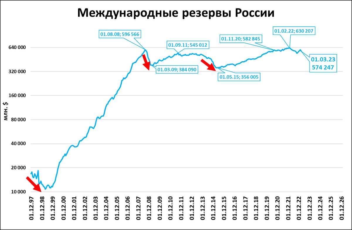 На 01.03.2023 ЗВР сократились до 574 млрд. долларов. Это на 22 млрд. ниже, чем месяц назад.