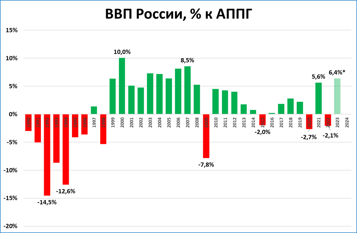 Такой взлёт индикатора, как сейчас, наблюдался в прошлом лишь дважды: в начале 2010 года (экономика выходила из провала 2009 года, в котором ВВП упал на 7,8%) и в начале 2021 года (экономика выходила из ковидного провала 2020 года).
