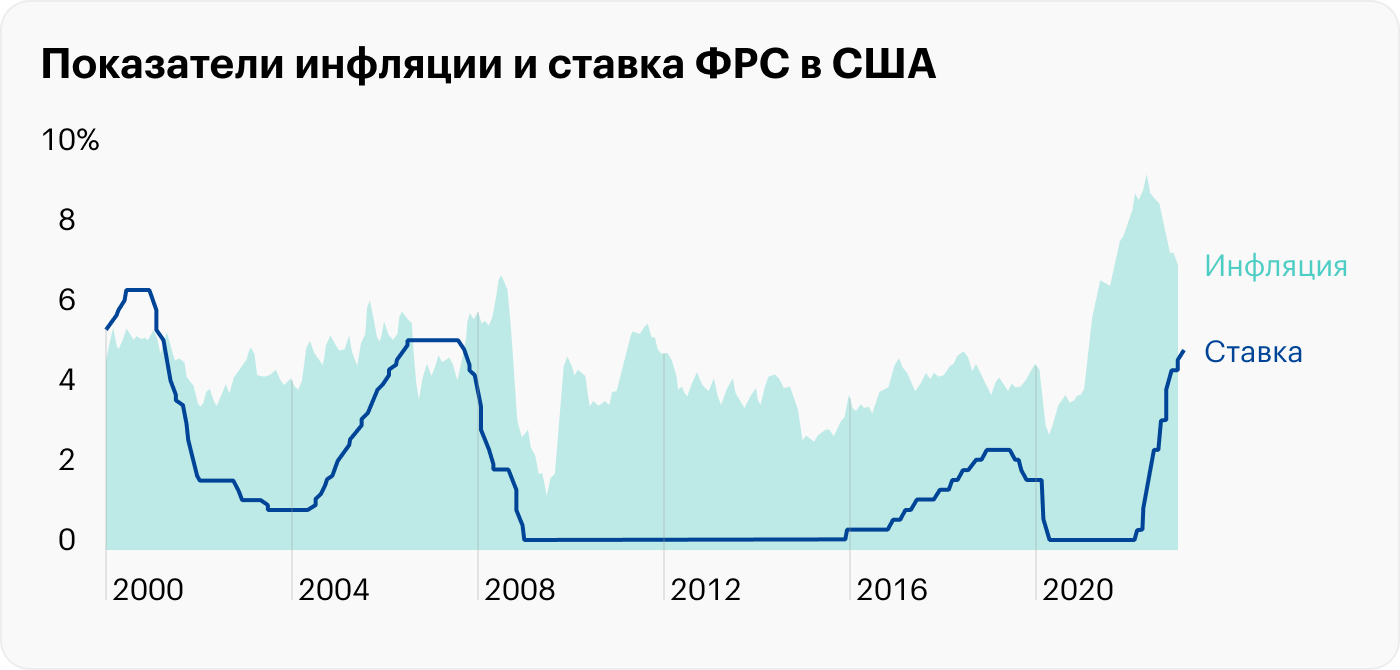 По состоянию на февраль 2023 года инфляция в США довольно высокая — 6%. Правда, это уже сильно меньше, чем было в июне 2022, тогда инфляция составляла 9,1%. Но такое снижение стало результатом крайне агрессивного повышения ставок ФРС: с июня по настоящий момент они выросли в три с лишним раза.