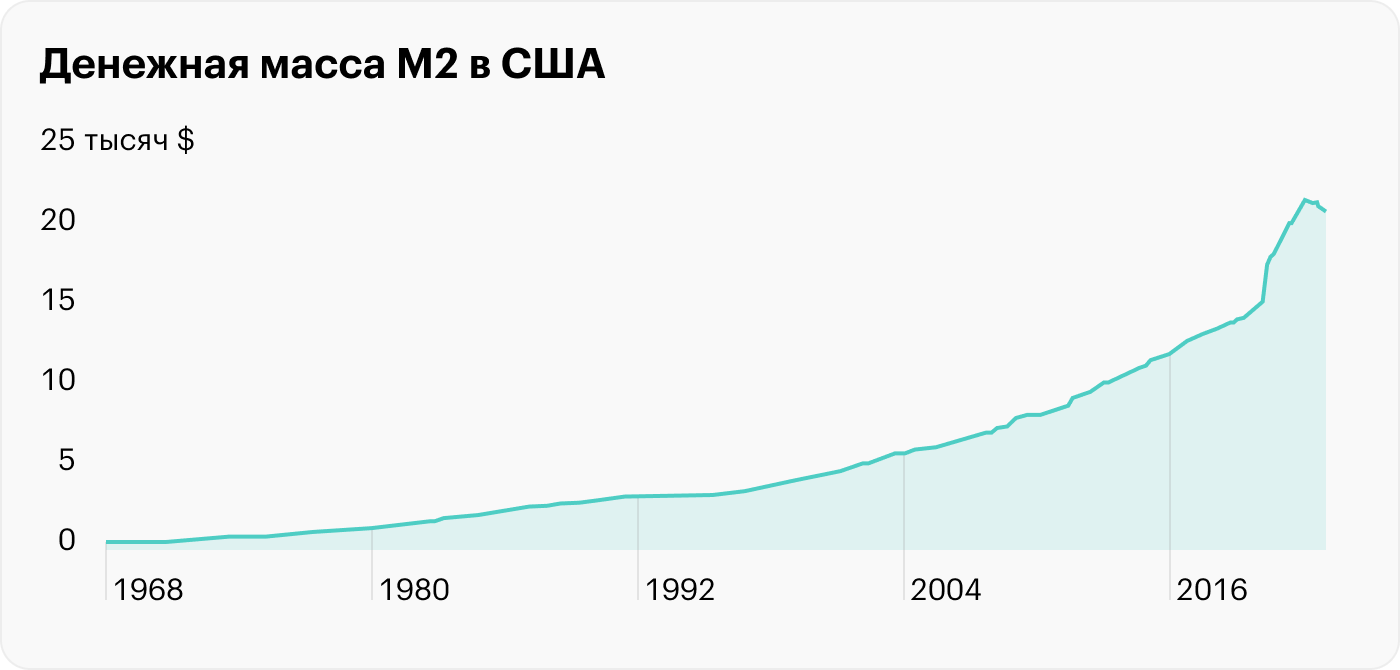 Так, масса М2 сильно выросла в период кризиса 2009—2011 годов и еще сильнее за несколько лет пандемии: ставки снижались, а в экономику шли деньги. ФРС покупала облигации у финансовых организаций в огромных количествах, и за счет этого у банков появилась денежная ликвидность, которую они по низким ставкам давали взаймы предприятиям и потребителям. Это назвали политикой количественного смягчения.