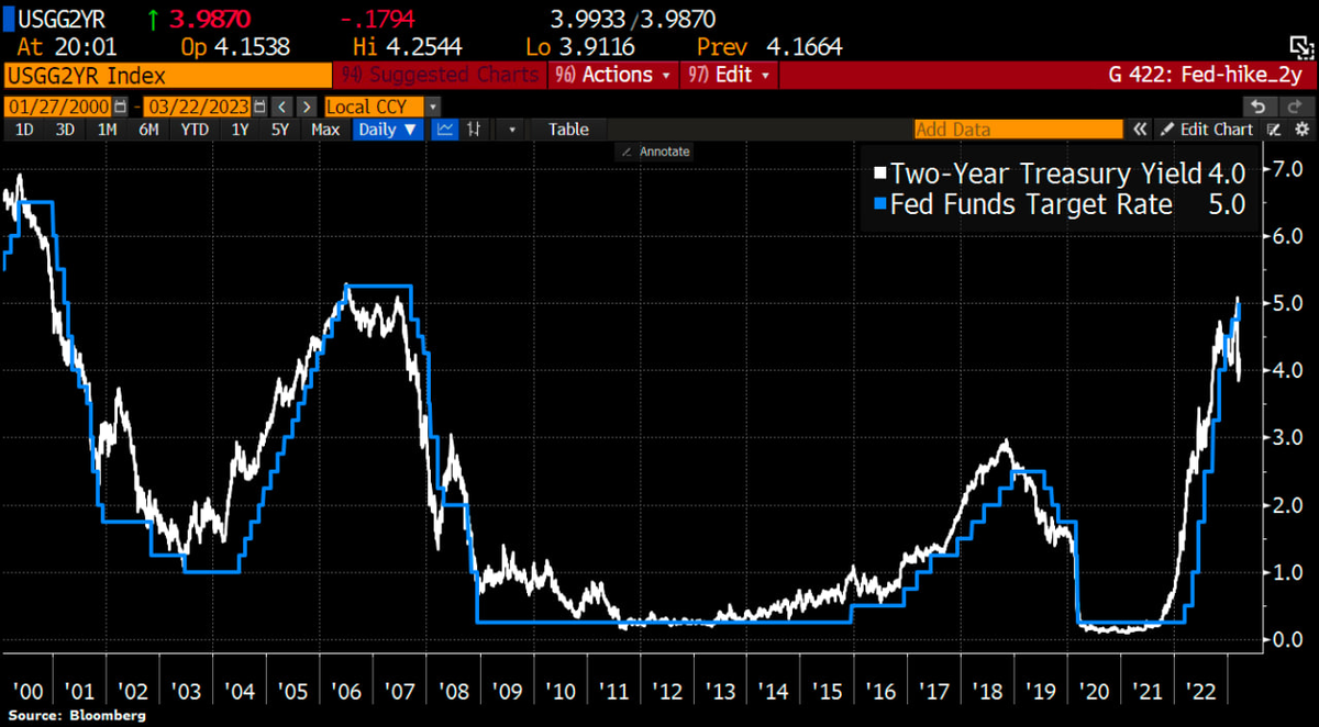 В американской системе пошла какая-то разбалансировка. Раньше она работала традиционно следующим образом: опережающим "индикатором" выступали доходности казначейских бондов (2-летки - белый график) - они растут, за ними подтягивается ставка Федрезерва (синий график), доходности пробивают ставку, ставка больше не подымается и в дальнейшем падает следом.