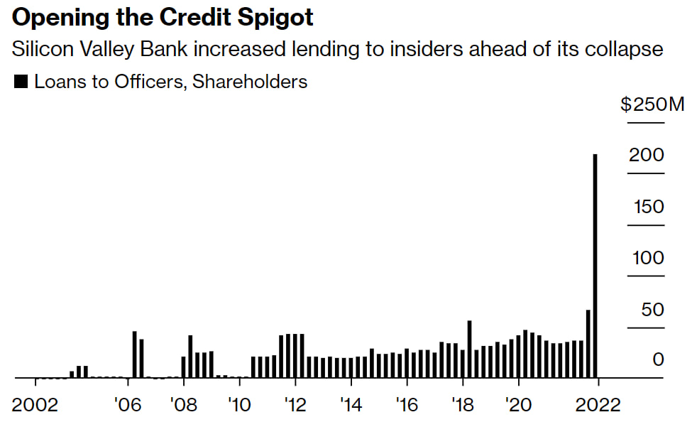 За последние три месяца 2022 года кредиты, выданные должностным лицам, директорам, основным акционерам и связанным с ними лицам, выросли более чем в три раза по сравнению с 3 кварталом и составили 219 млн долларов. Это рекордная сумма кредитов, выданных инсайдерам, по крайней мере, за последние два десятилетия. Заметим, что недостатки в управлении рисками регулирующие органы начали выявлять именно перед тем, как уважаемые люди начали активно кредитоваться.