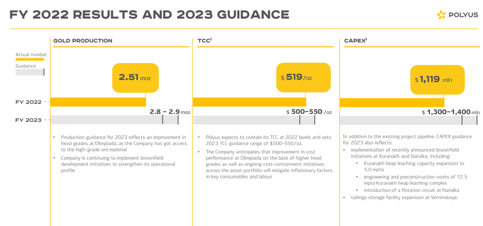 Также компания представила прогноз на 2023 год. Ожидается рост производства золота примерно на 15%. Денежные затраты на проданную унцию будут примерно такими же. Кап затраты, как мы отмечали выше, вырастут примерно на 20%.