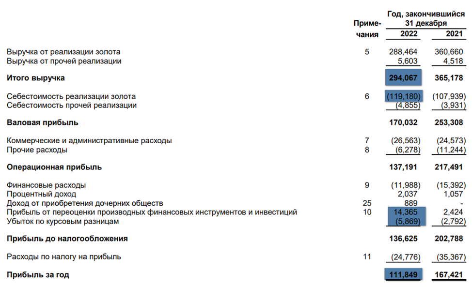 Во многом из-за этого основные показатели 2022 года снизились. Общий объем производства на 6%. А объем производства аффинированного золота на 9%. Падение производства более чем на 10% зафиксировано на Олимпиаде, Благодатном и Наталке.