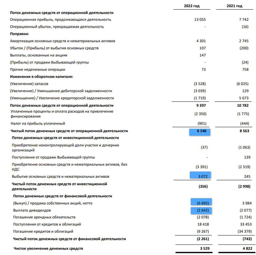 Также отметим, что 6,7 млрд было потрачено на обратный выкуп своих акций. Этот факт позитивен для акционеров, правда, в данном случае, они квазиказначейские, т.е. выкупаются на баланс дочерних предприятий. На 31.12.22 в собственности компаний, входящих в BELUGA GROUP, находилось 4,6 млн квазиказначейских акций.
