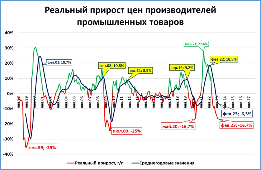 Падение цен производителей в России в реальном выражении составило -16,7% годовых.