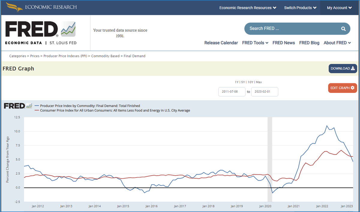 В США цены производителей снижаются (синяя линия на графике ниже).