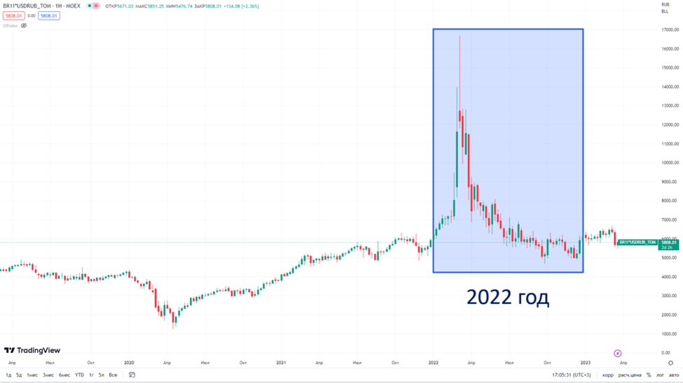 Цены в рублях носят более волатильный характер. Из-за девальвации нашей валюты, начавшейся в 4 квартале, цены на нефть в рублях держатся в боковике с лета прошлого года.