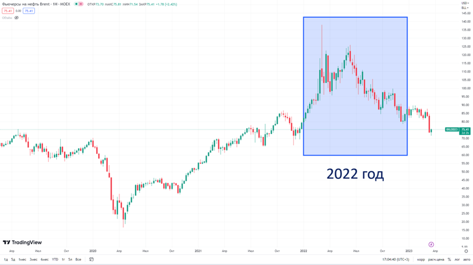 В целом цены на нефть марки BRENT в прошлом году были выше, чем в 2021 году. Причём первые полгода был неплохой рост. Но за второе полугодие цены откатили на начало года. В 2023 году нисходящая тенденция продолжилась.