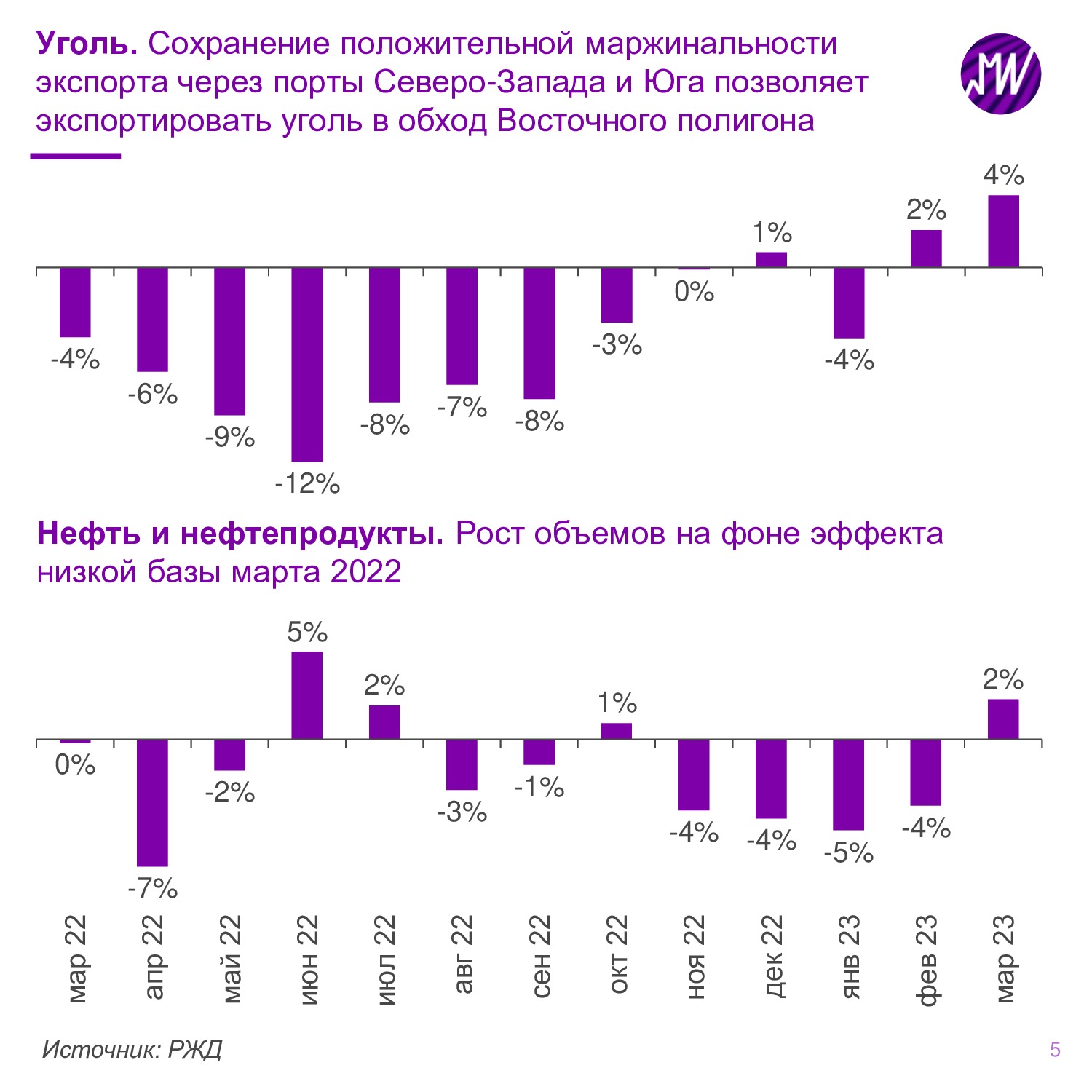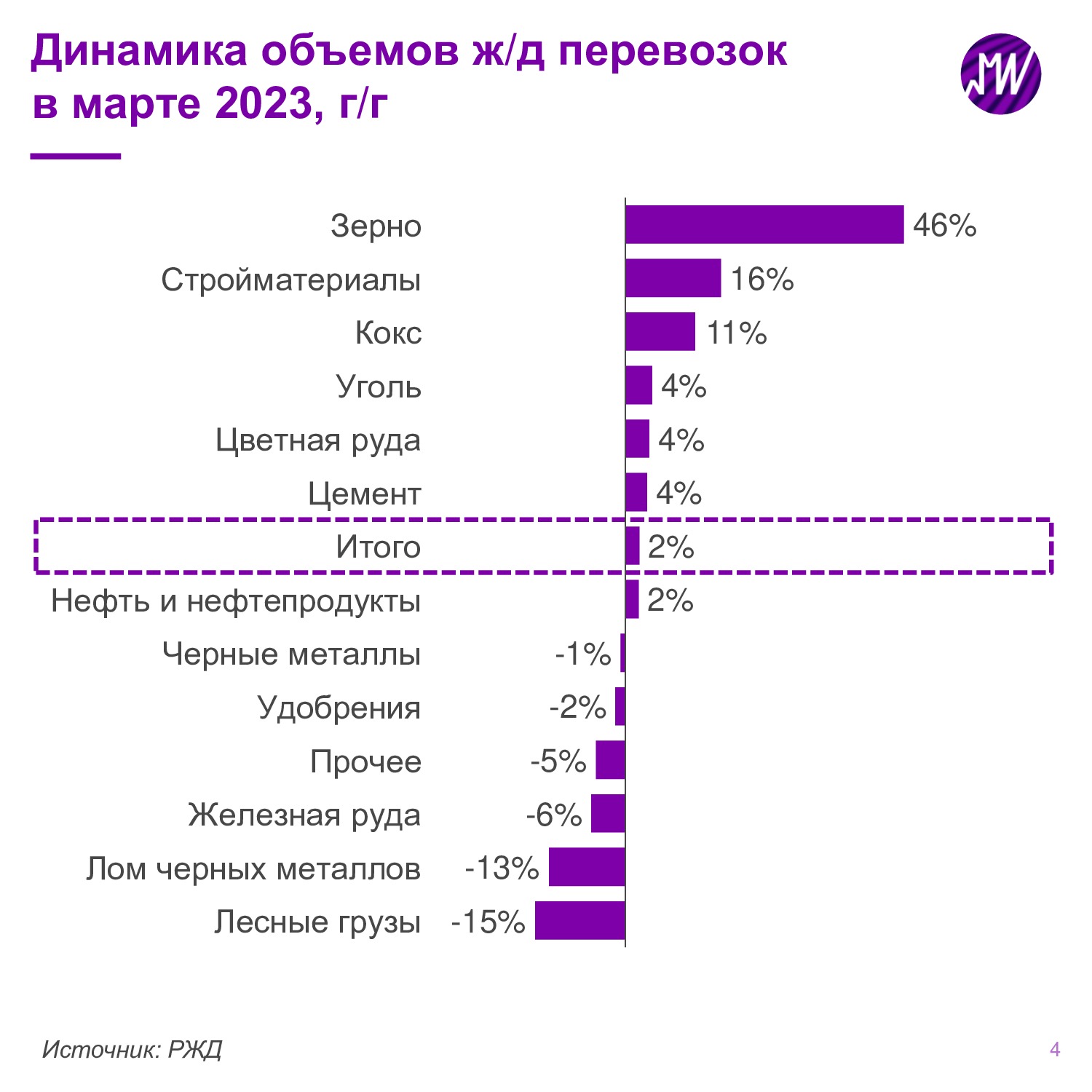 📈 В марте объемы погрузки выросли на 2,3% г/г до 109,1 млн тонн, превзойдя ожидания РЖД (108,5 млн тонн).
