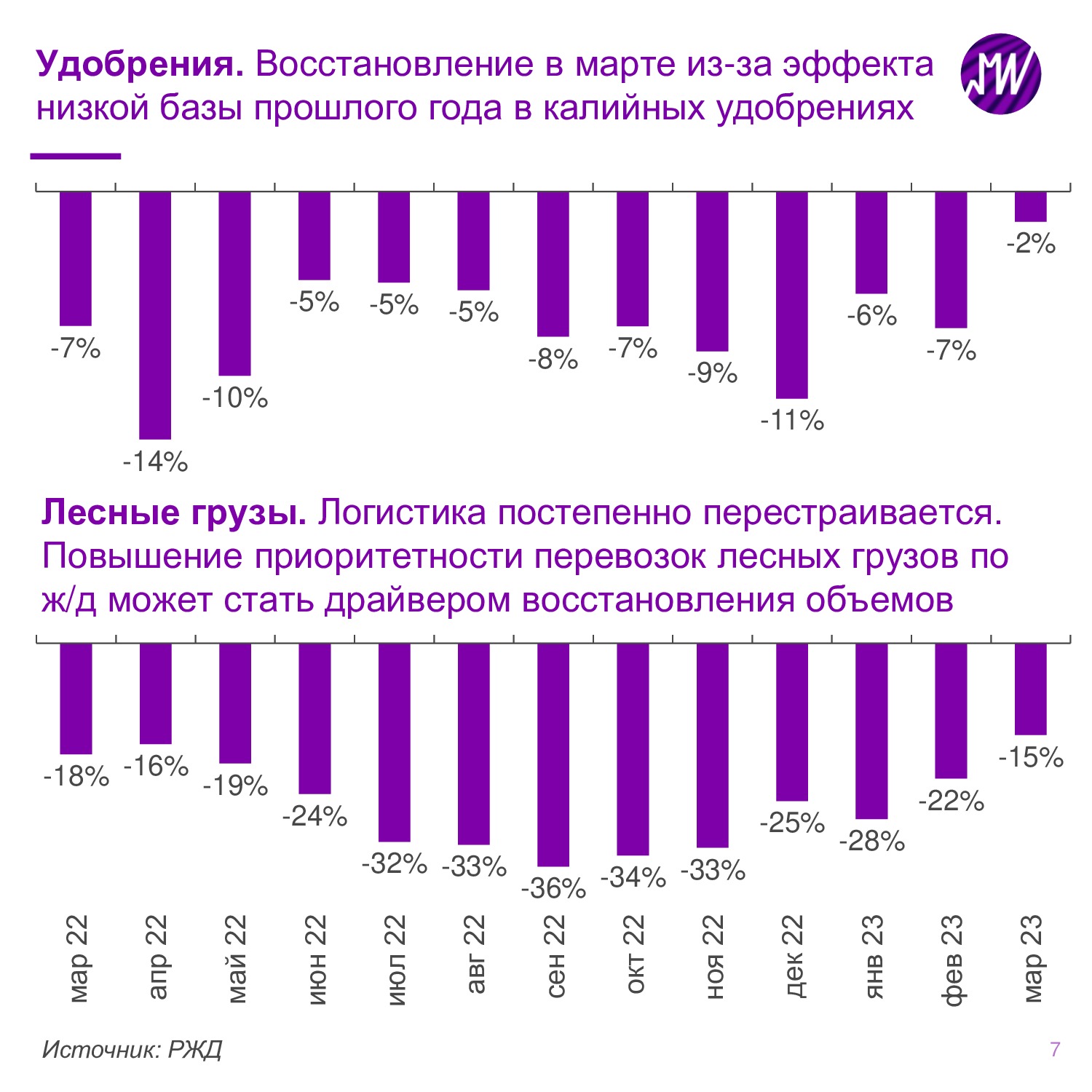 🌲 Лесные грузы. Значительное восстановление в марте (-15% г/г vs -22% в феврале) на фоне нормализации логистики и эффекта низкой базы. Повышение приоритетности перевозки лесных грузов по ж/д в совокупности с увеличением объема субсидий может стать драйвером роста объемов. Умеренно-позитивно для Сегежи.