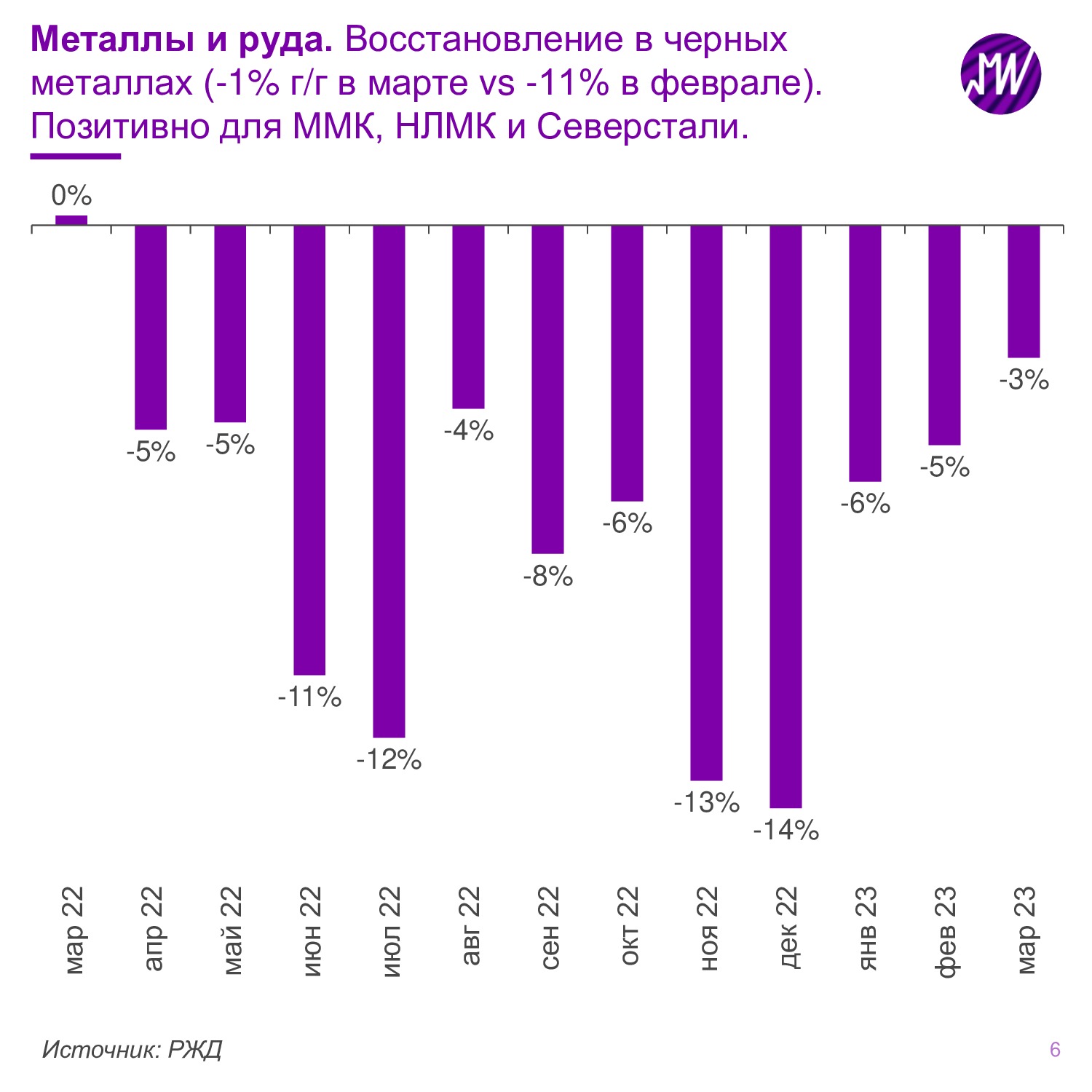 ⛓️ Черные металлы. Значительное восстановление в марте 2023 (-1% г/г vs -11% в феврале) на фоне эффекта низкой базы. Предпочитаем держать экспозицию на сектор через ММК и НЛМК.