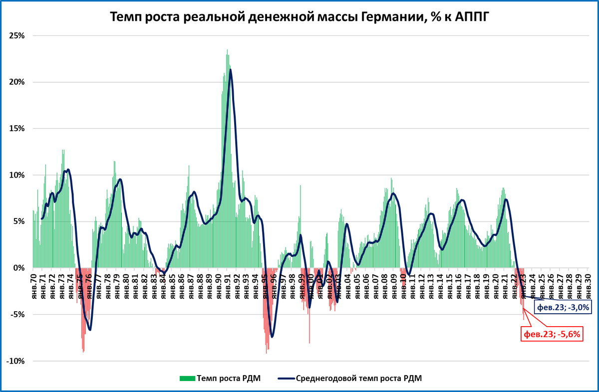 Важно отметить, что денежная масса в Германии уже с марта 2022 года растёт медленнее цен.