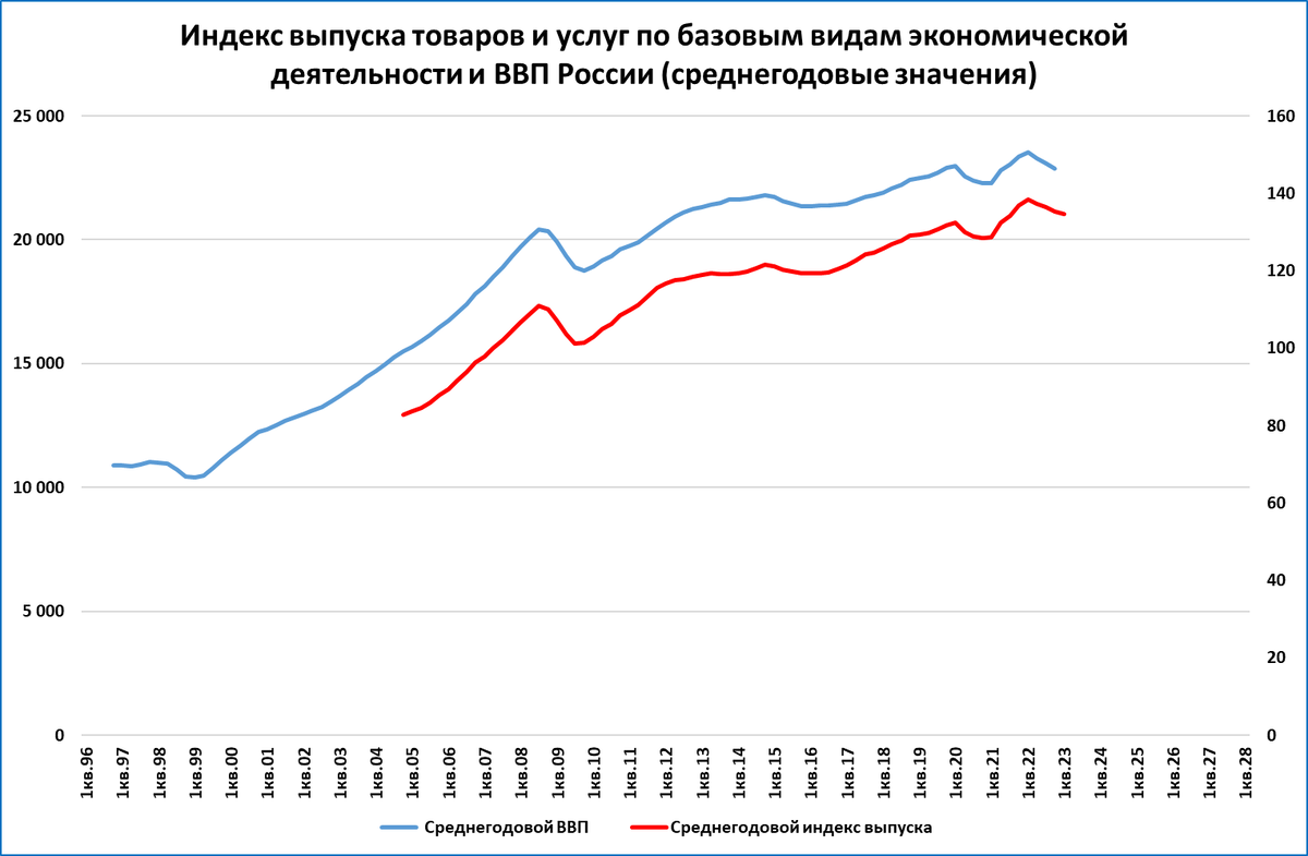 Промпроизводство — это около 32% ВВП. Выпуск же по базовым видам деятельности – это уже около 60% ВВП, так как кроме промпроизводства включает в себя сельское хозяйство, строительство, торговлю, транспорт.