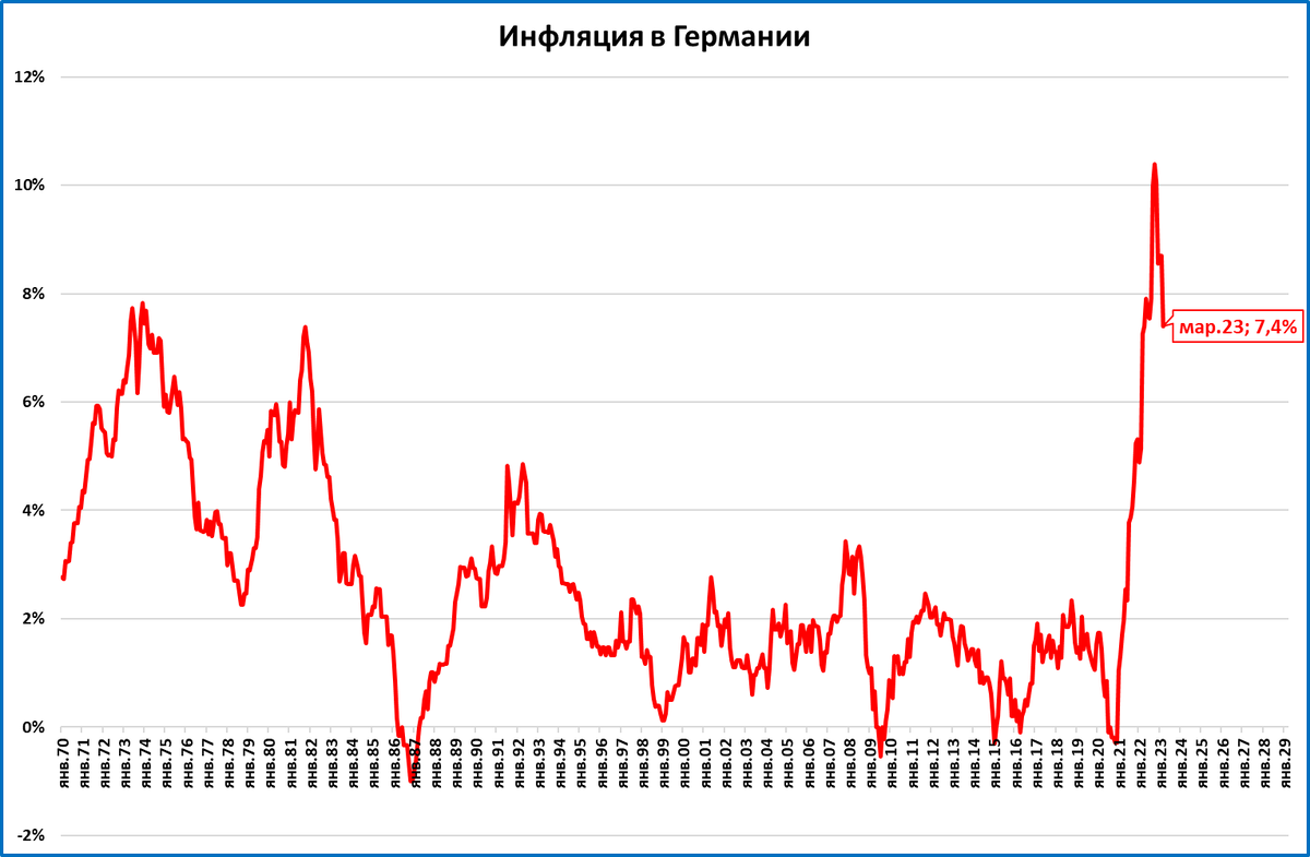 Инфляция в Германии снизилась до 7,4% годовых по итогам марта (с 8,7% по итогам февраля)