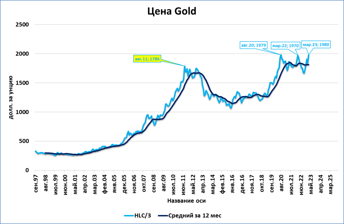 Уже более двух лет среднегодовые цены остаются на уровне около 1800 унций (тёмно-синяя линия на первом графике).