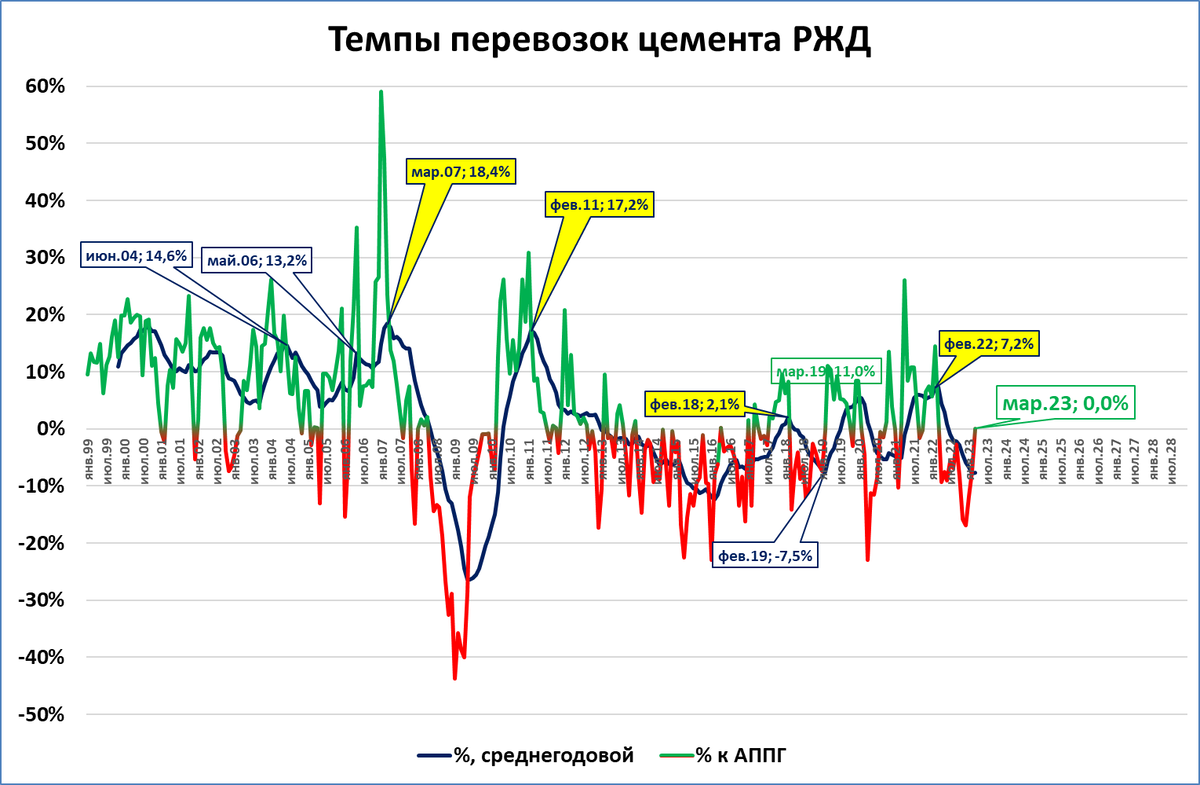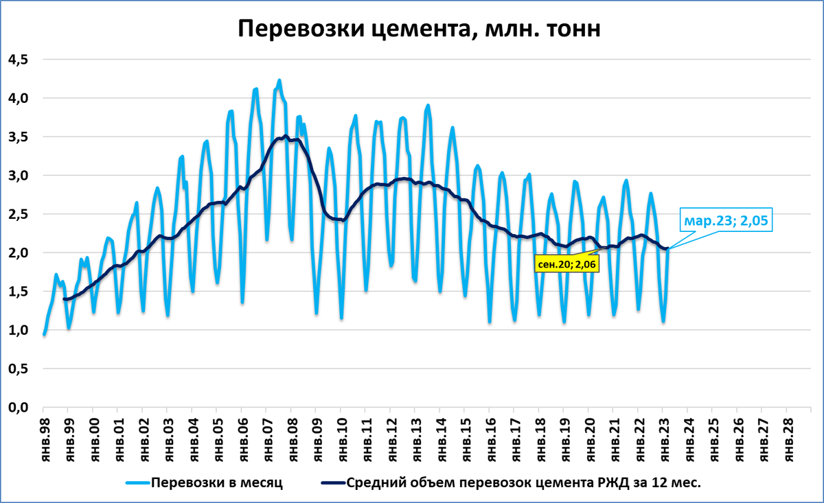 ● Перевозки цемента по железным дорогам в марте повторили результат марта прошлого года. Падение, длившееся с февраля прошлого года, прекратилось.
