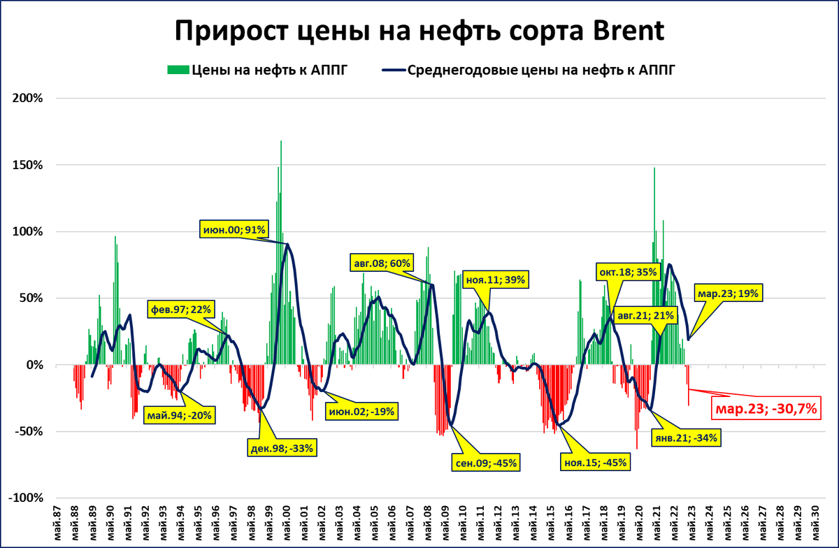● Нефть сорта Брент в марте на 31% дешевле, чем в марте прошлого года.