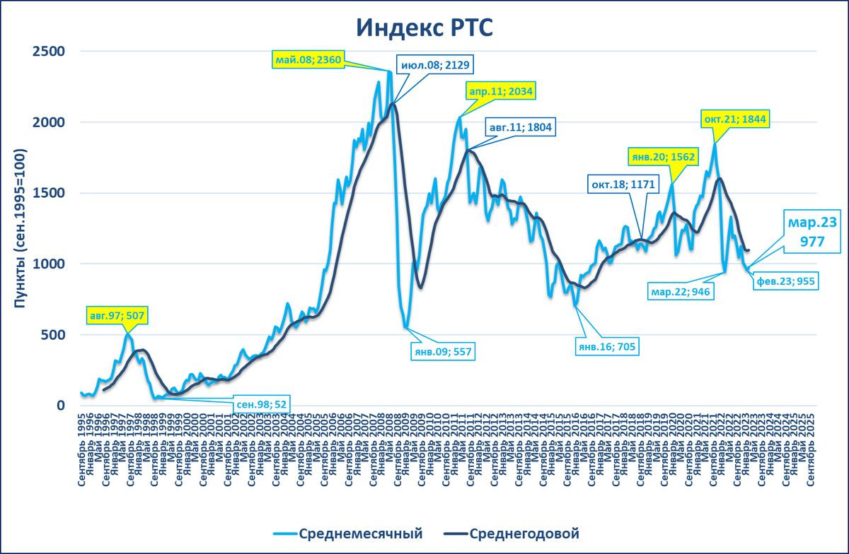 Долларовый индекс РТС в марте котировался на уровне 977 пунктов.