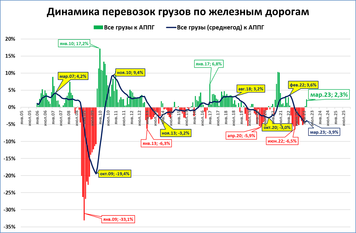 Очевидно, что октябрь стал низшей точкой в цикле снижения индекса. Важно также отметить один из важных признаков будущего роста: в марте индекс впервые за последние 15 месяцев (с декабря 2021) поднялся выше своих среднегодовых значений (голубая линия стала выше синей).