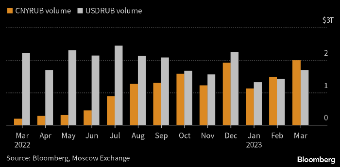 В феврале — спустя почти год после начала СВО и введения Западом санкций против России — китайский юань впервые в истории обогнал доллар по объему торгов на Московской бирже. В марте разрыв между ними продолжил увеличиваться, тогда как до указанных выше событий юань мало кого интересовал с точки зрения биржевой торговли.