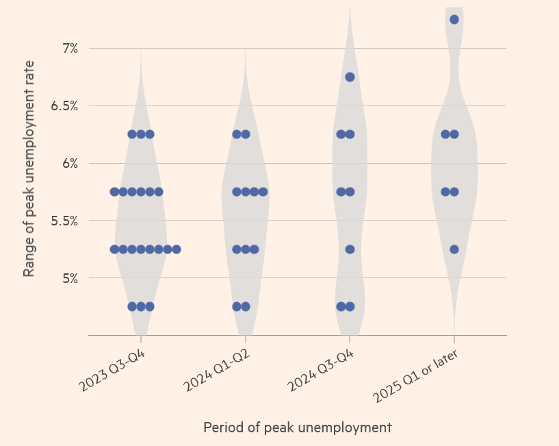 Распределение прогнозов по пиковой безработице в опросе, проведенном UCBSB и "Файнэншл Таймс"