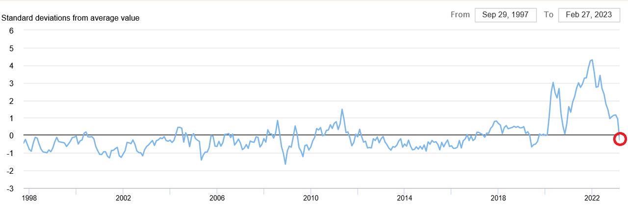 В мрачном воображении Рубини инфляция (которая, напомню, в США по факту остаётся заякоренной) не реагирует на заморозку выдачи кредитов банками. В мрачном воображении Рубини до сих пор царят шоки в цепях поставок. В объективной реальности, тем временем, Китай уже упразднил все ковидные ограничения, исчезли очереди из контейнеровозов в портах, нехватка микрочипов сменилась их переизбытком, а индекс нагрузки на глобальные цепи поставок, рассчитываемый ФРБ Нью-Йорка, упал ниже средних исторических значений.